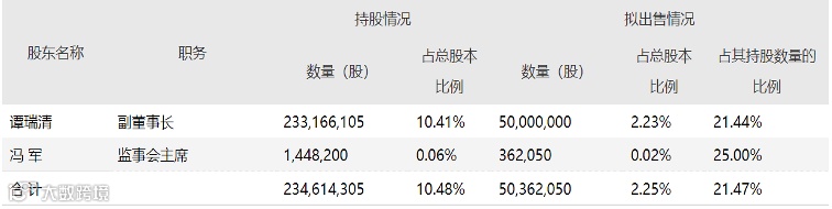 龙蟒佰利3月8日晚间公告,公司于近期分别收到副董事长谭瑞清、监事会主席冯军出具的《股份减持计划告知函》,计划自公告披露之日起15个交易日后的6个月内通过集中竞价交易、大宗交易的方式减持公司股份合计不超过5036.21万股(占公司总股本比例的2.25%)。减持原因为自身资金需求。减持期间为自减持计划之日起15个交易日后的6个月内。