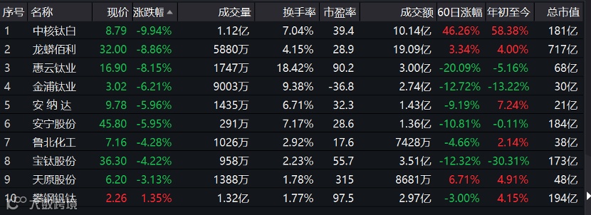 3月9日,钛白粉板块大幅下挫,龙头股龙蟒佰利领跌。