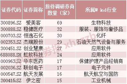 2月接待调研券商数量较多的个股还包括稳健医疗、恒逸石化、杰瑞股份、创业慧康、虹软科技,接待调研券商数量均在20家以上。根据Wind行业分类,这些个股覆盖了服装服饰、化纤、石油天然气设备与服务、应用软件等行业领域。
