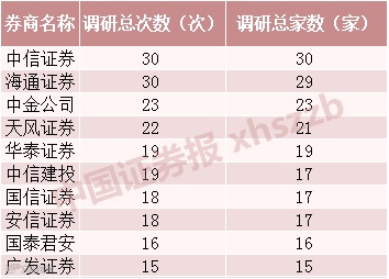 Wind数据显示,2月调研上市公司最为活跃的券商是中信证券和海通证券,均为30次,调研上市公司数量分别为30家、29家;调研上市公司较活跃的券商还包括中金公司、天风证券、华泰证券、中信建投证券、国信证券、安信证券等。