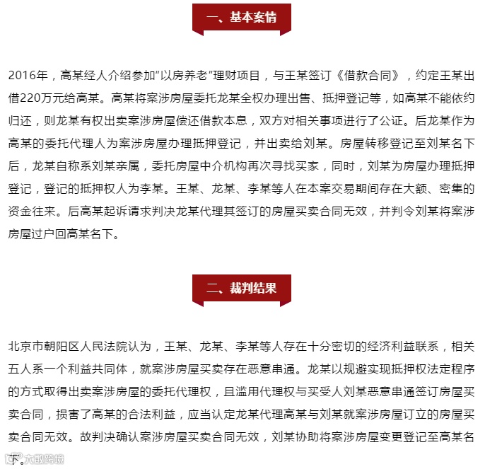 高某诉刘某、龙某确认合同无效纠纷案提示,老年人“以房养老”理财需谨慎。