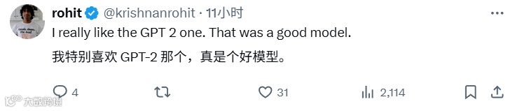 GPT-2 的人气也颇高。有网友怀念它 “牙牙学语” 般的创作风格:“虽然它写的诗不完美,但那种天马行空的想象力,现在的模型很少有了。”GPT-2 处于模型发展的过渡阶段,既有了一定的语言组织能力,又没有完全摆脱早期的 “野性”,它的回答像孩子的涂鸦,虽然稚嫩,却充满了真诚与创造力。它不会刻意追求 “正确” 或 “完美”,只是按照自己的 “理解” 去表达,这种表达中蕴含的随机性与独特性,在高度优化的后期模型中难以见到 —— 后期模型为了追求精准与周全,往往会选择更稳妥、更规范的表达,从而在一定程度上失去了这种 “意外的惊喜”。