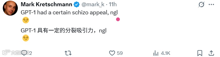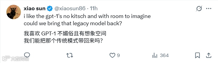 有网友毫不掩饰对 GPT-1 的喜爱:“有点狂野,我喜欢。不媚俗,希望 OpenAI 把它带回来。” 甚至有人认为,GPT-1 更像 “真正的 AGI”。在技术层面,GPT-1 的表现显然无法与后续模型相比,但它的 “狂野” 恰恰成了吸引人的特质。它的回答不受常规逻辑的束缚,偶尔会出现一些天马行空的想法,甚至是 “错误” 却有趣的表达,这种 “不完美” 反而让它显得更 “真实”—— 就像人类在思考时会犯错、会有跳跃性思维一样,GPT-1 的 “胡言乱语” 中,反而透着一种未经雕琢的 “灵气”,没有被标准化的回答模式所固化,少了些 “机器味”,多了些 “人情味” 的雏形。