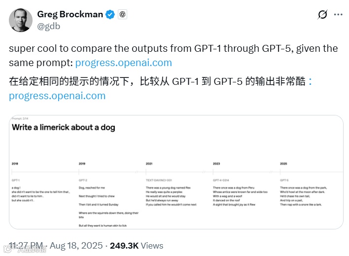 自 2018 年至今,七年时间里,GPT 系列模型已悄然来到第五代。这七年,是人工智能自然语言处理领域飞速发展的七年,也是 GPT 系列从蹒跚学步的 “稚童” 成长为能独当一面的 “全能助手” 的七年。当我们回望与 GPT-1 初次相遇的时刻,那种新奇中夹杂着对其 “笨拙” 的无奈,仍清晰如昨;而如今与 GPT-5 交互时,又会被它的精准、周全甚至富有人情味所打动。OpenAI 总裁兼联合创始人 Greg Brockman 不久前分享的帖子,通过相同提示下 GPT-1 到 GPT-5 输出的对比,为我们直观展现了这场跨越七年的惊人蜕变,也意外引发了人们对 AI 发展过程中诸多深层问题的思考。