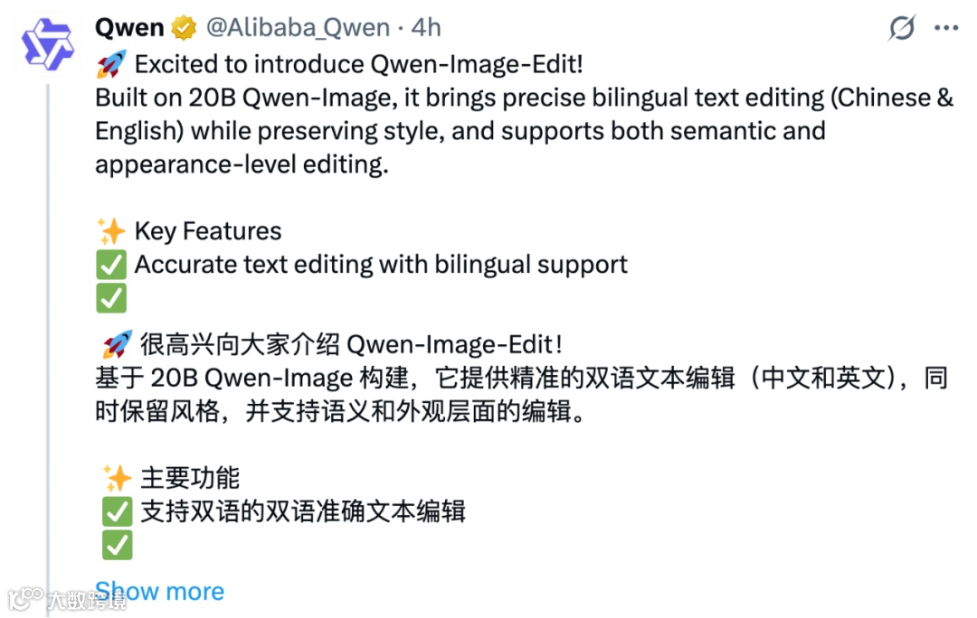 2025 年 8 月 19 日凌晨,阿里巴巴通义千问团队正式发布了新一代图像编辑模型 Qwen-Image-Edit。这一基于 200 亿参数 Qwen-Image 架构的创新产品,以其颠覆性的语义与外观双重编辑能力、精准的双语文字处理技术,以及在多个权威基准测试中刷新 SOTA(State-of-the-Art)的表现,迅速引发全球 AI 领域震动。正如网友所言:"有了这个图像编辑大杀器,几乎没有什么理由再使用 Photoshop 了。"