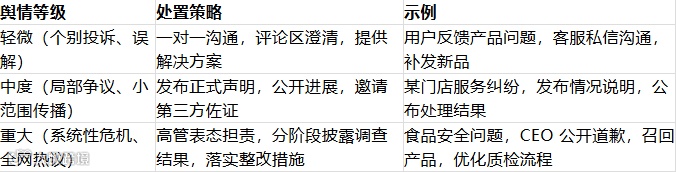 根据舆情轻重分级,制定差异化处置流程及话术,明确发声主体、渠道、时限,防止多头回应和延迟。