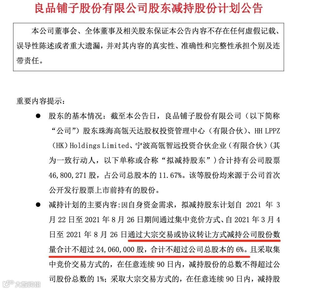 A股再现大额减持计划!有“高端零食第一股”之称的良品铺子今晚公告,公司股东珠海高瓴、HH LPPZ、宁波高瓴拟减持合计不超过2406万股公司股票,占公司总股本的6%。按照良品铺子2月26日收盘价65.05元/股来计算,此次高瓴资本若顶格减持,总金额将高达15.65亿元。
