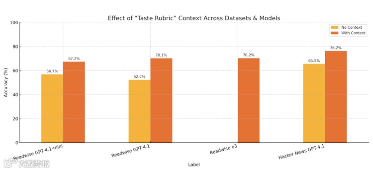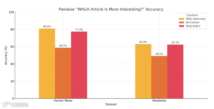前内容平台创始人 Edmar 的实证研究揭示了上下文信息对预测精度的关键影响。实验采用 Readwise 和 Hacker News 的行为数据,通过四组对照实验得出相关结果。在无上下文的条件下,使用 GPT-4.1 时,Readwise 的准确率为 52.2%,Hacker News 的准确率为 65.5%;当加入 "品味准则" 后,Readwise 准确率提升至 70.1%,Hacker News 准确率提升至 76.2%;经过 DSPy 提示优化后,Readwise 准确率达到 73.9%,Hacker News 准确率达到 78.6%;而在相对判断任务中,优化后的 Hacker News 准确率则为 80.9%。