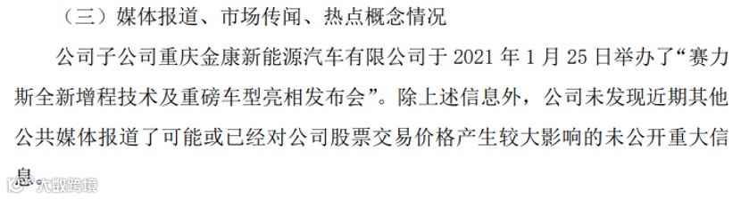 1月26日晚,小康股份发布公告称,公司股票价格于1月22日、1月25日、1月26日连续三个交易日内收盘价格涨幅偏离值累计达到20%,属于股票交易异常波动的情况。公司子公司重庆金康新能源汽车有限公司(简称“金康新能源”)于1月25日举办了“赛力斯全新增程技术及重磅车型亮相发布会”。除上述信息外,公司未发现近期其他公共媒体报道了可能或已经对公司股票交易价格产生较大影响的未公开重大信息。