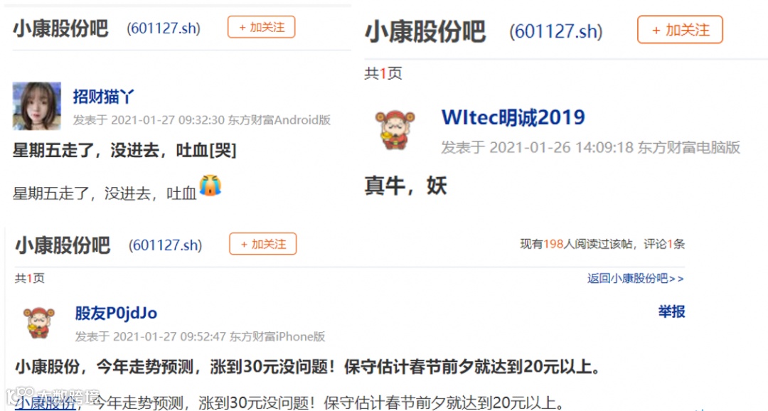 该消息一经发布,小康股份股价连续2个交易日涨停。股吧里,有投资者评价道:“真牛,妖!”1月22日提前下车的投资者,更是“吐血”!有投资者预测:“今年涨到30元没问题!保守估计春节前夕就达到20元以上。”