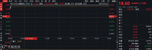 1月27日,小康股份高开高走,随即涨停,报收18.6元/股,已连续2个交易日涨停。