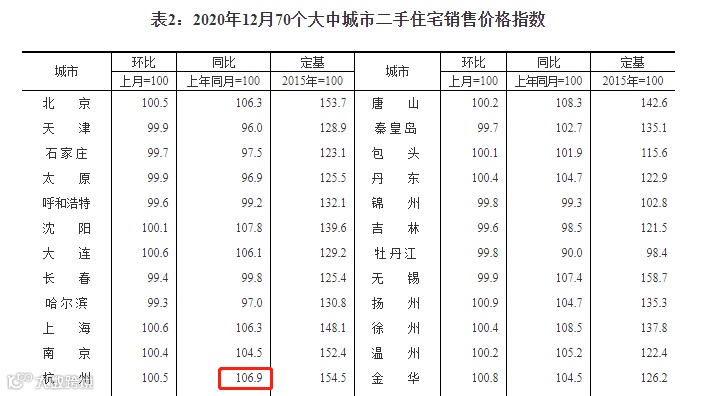 国家统计局数据显示,2020年12月,杭州新建商品住宅销售价格环比下降0.3%,同比增长4.5%;二手住宅销售价格环比增长0.5%,同比增长6.9%。同比涨幅高于多数一线城市和热点二线城市。