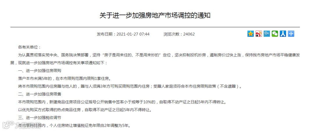 1月27日,杭州市住房保障和房产管理局官网披露,杭州市房地产市场平稳健康发展领导小组办公室发布《关于进一步加强房地产市场调控的通知》(简称《通知》)。