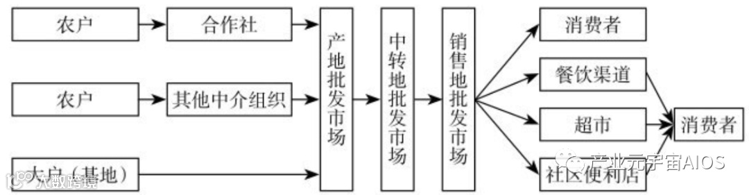 经历了从农民(种植养殖户)/农业合作社→ 产地批发市场→中转地批发市场→销售地批发市场几个市场主体的流转。