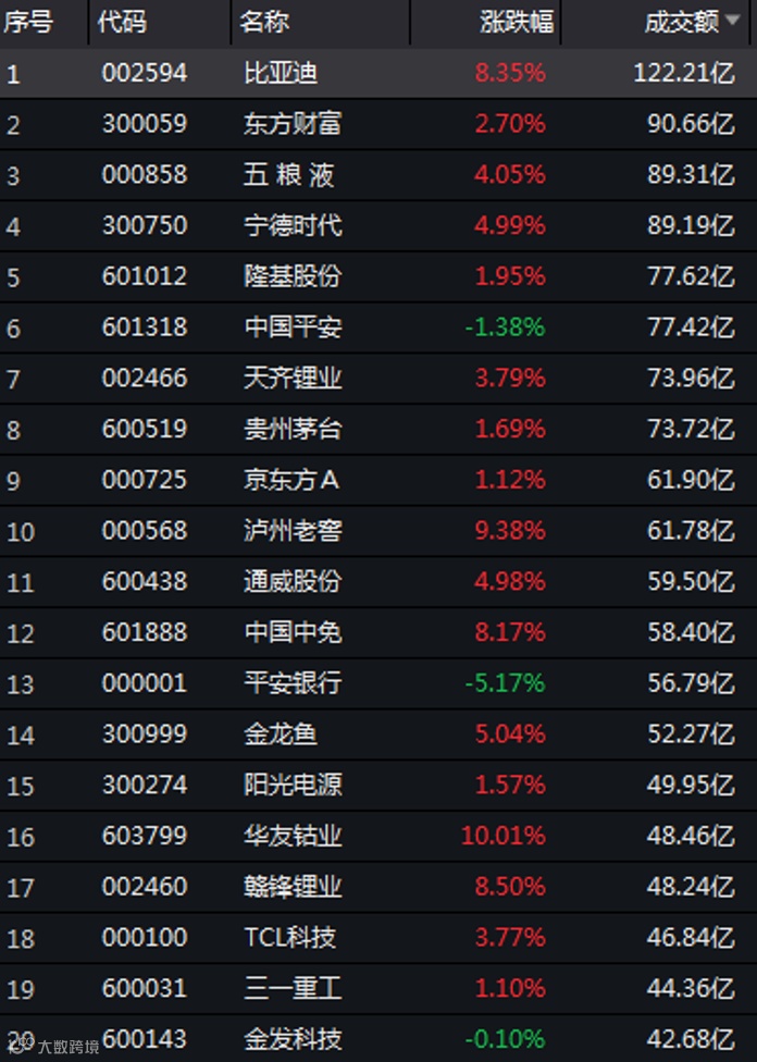 今日成交额前20个股涨跌幅