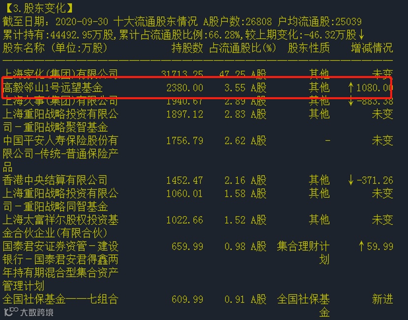 不过值得注意的是,在上海家化前十大流通股东中(截至2020年三季度),多家知名机构在列,其中冯柳旗下的高毅邻山1号远望基金位居第二大流通股东。