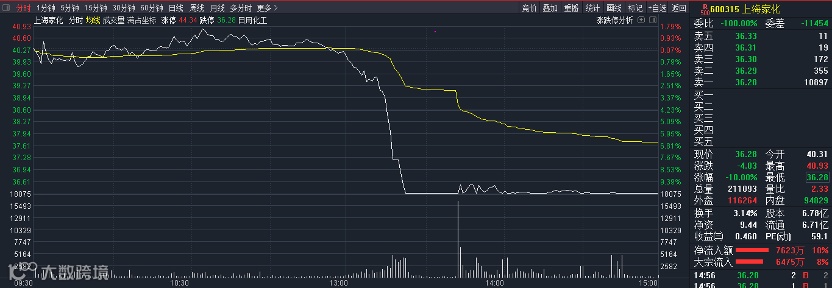 上海家化午后闪崩跌停,报36.28元,成交额为7.96亿元。