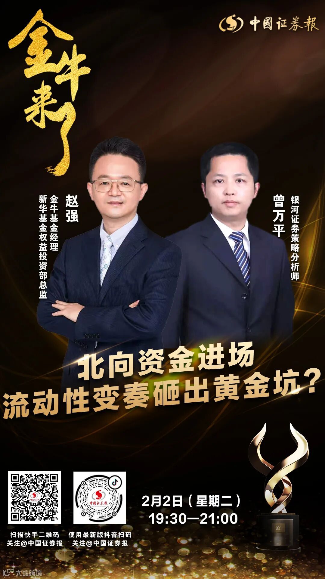 2月2日(周二)晚7点半,金牛基金经理、新华基金权益投资部总监赵强,银河证券策略分析师曾万平将做客中证报“金牛来了”,围绕“北向资金进场 流动性变奏砸出‘黄金坑’?”主题,与你在线分享市场观点,交流投资心得。