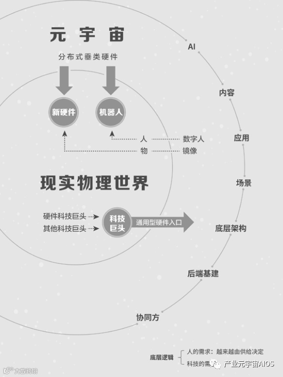 一方面,元宇宙中的“存在”、应用、场景等,反向映射回现实世界——以供给的方式满足人未来的需求——显现为新硬件;