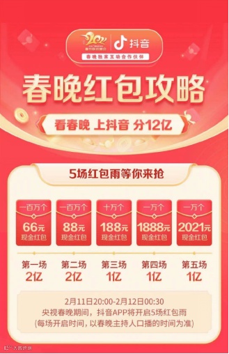 今年,抖音成为央视春晚独家互动合作伙伴。央视春晚期间,抖音APP将开启5场红包雨,一共送出现金7亿元。