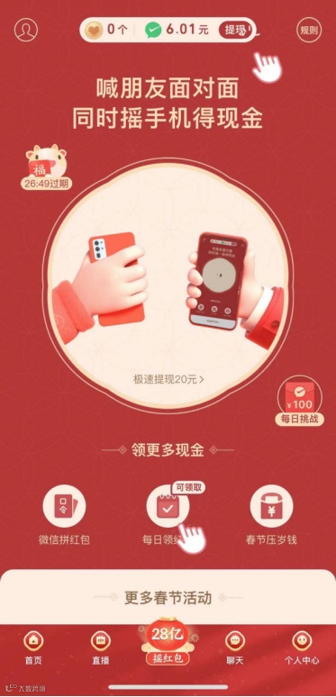 截至目前,金额最多的是拼多多,奖池为28亿元,其玩法以拉好友为主:用户进入活动页面后,可与好友同时摇手机拼出红包,获得红包奖励(包括现金奖励、现金币、优惠券等权益)。
