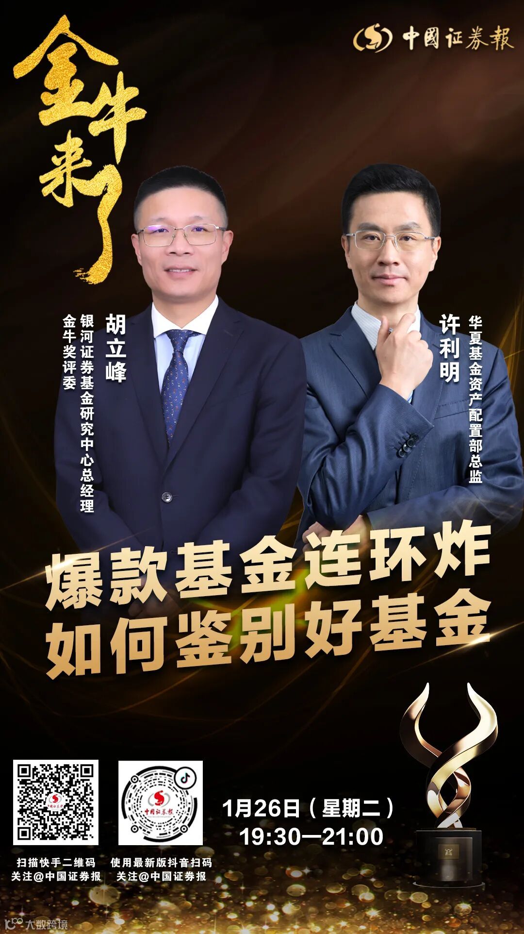 1月26日(周二)晚7点半,华夏基金资产配置部总监许利明,银河证券基金研究中心总经理、投顾策略管理组组长、金牛奖评委胡立峰将做客中证报“金牛来了”,围绕“爆款基金连环炸 如何鉴别好基金”主题,为您在线答疑解惑。