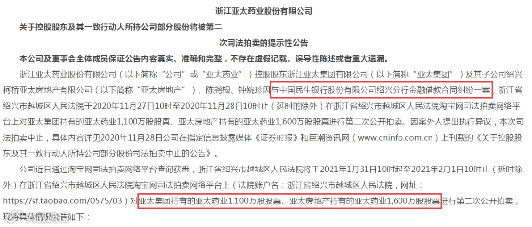1月18日时,亚太药业发布了一份控股股东及其一致行动人所持公司部分股份将被第二次司法拍卖的提示性公告公告。公告显示,因与中国民生银行股份有限公司绍兴分行金融借款合同纠纷,亚太药业2700万股股票将被拍卖。