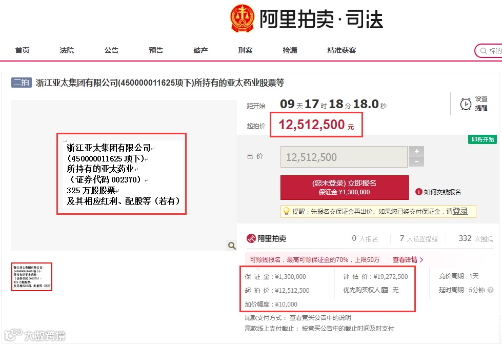 中国证券报记者在阿里拍卖上查到了亚太药业股票拍卖标的,该拍卖标的为325万股亚太药业的股票,起拍价为1251万元,折算每股价格为3.85元。