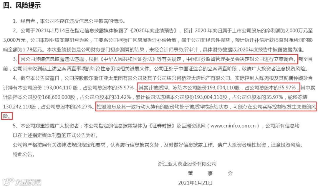 此外,在1月21日的股票交易异常波动公告中,亚太药业表示因公司涉嫌信息披露违法违规,证监会决定对公司进行立案调查;同时,控股股东及其一致行动人持有的股份均处于被质押或冻结状态,可能存在公司实际控制权发生变更的风险。
