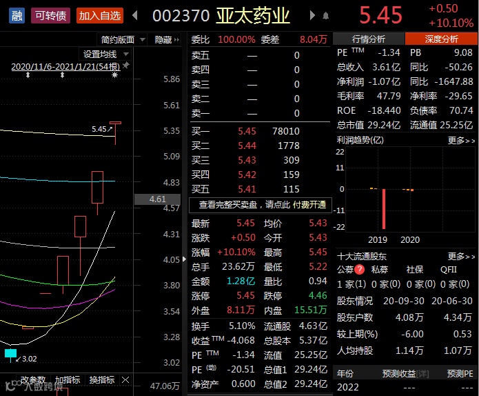 在这些连板个股中,目前最为耀眼的就是6连板的亚太药业,股价在短短6个交易日从不到3元涨到了目前的5.45元。