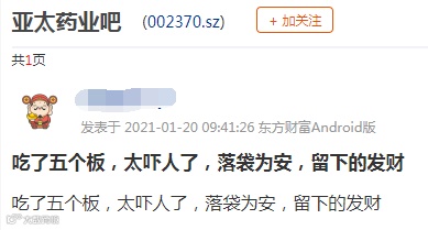 在亚太药业的股吧中,有投资者惊呼:“吃了五个板,太吓人了,落袋为安。”