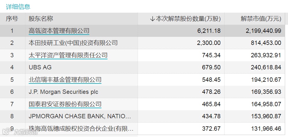 值得注意的是,截至目前,宁德时代市值为8249亿元,2月4日解禁的定向增发机构配售股为宁德时代2020年7月17日完成的197亿元定增,9名发行对象以161元/股的价格认购,锁定期为6个月。