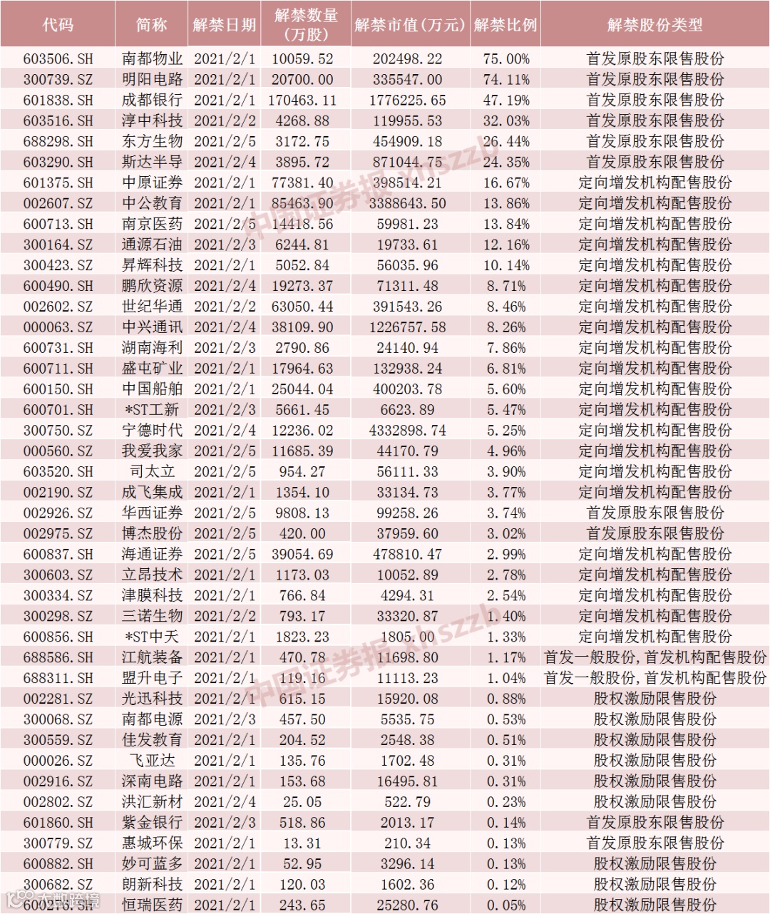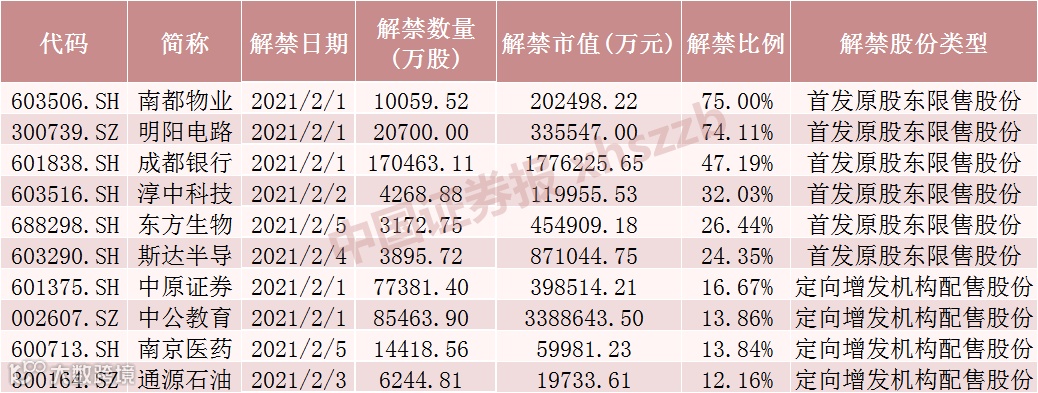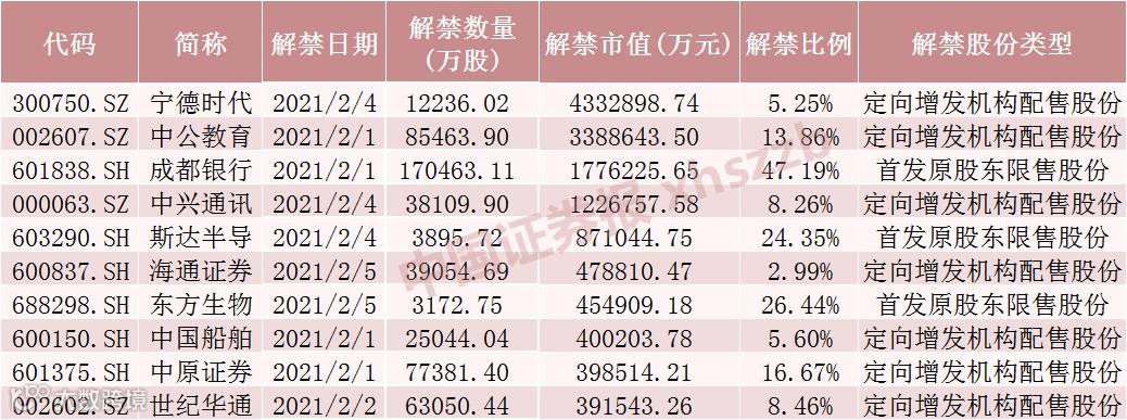 具体来看,Wind数据显示,宁德时代2月4日将解禁1.22亿股,均为定向增发机构配售股份。中公教育2月1日将解禁8.55亿股,均为定向增发机构配售股份。成都银行2月1日将解禁17.05亿股,均为首发原股东限售股份。中兴通讯2月4日将解禁3.81亿股,均为定向增发机构配售股份。