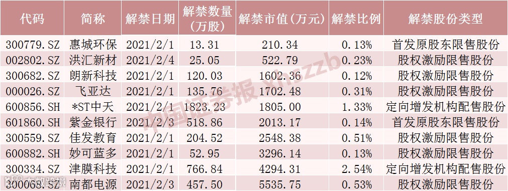 在下周面临解禁的42只个股中,惠城环保、洪汇新材、朗新科技、飞亚达、*ST中天解禁市值不足2000万元,其中洪汇新材、朗新科技、飞亚达均为股权激励限售股份解禁,*ST中天为定向增发机构配售股份解禁,惠城环保为首发原股东限售股份解禁。
