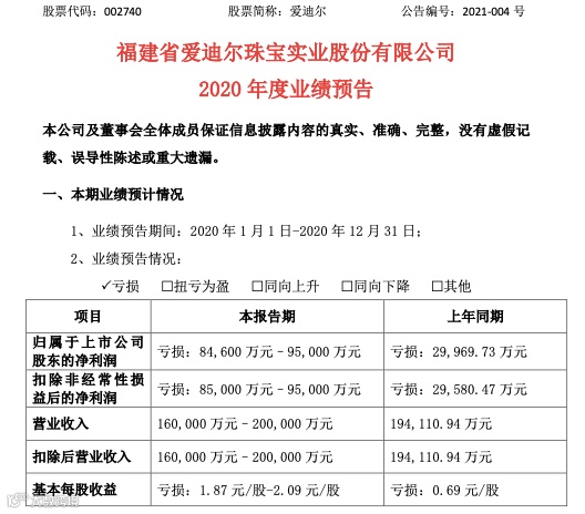 1月20日晚,爱迪尔发布业绩预告,预计2020年将亏损8.46亿元-9.5亿元,亏损额大幅高于2019年的亏损额3亿元。公司对子公司失去控制、重组标的无法完成业绩承诺。