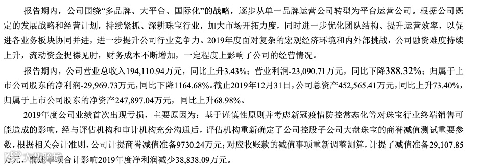 二是受疫情影响,重大资产重组标的公司江苏千年珠宝有限公司、成都蜀茂钻石有限公司预计2020年无法完成原定业绩承诺,公司预计本年度计提商誉减值准备。