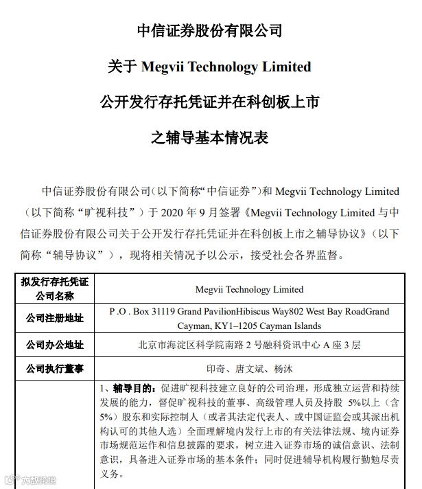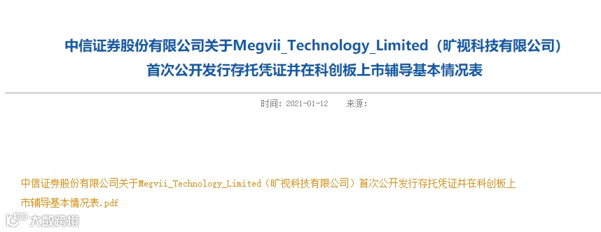1月12日,据北京证监局网站消息,国内AI独角兽企业旷视科技已于2020年9月与中信证券签署关于公开发行存托凭证并在科创板上市之辅导协议。