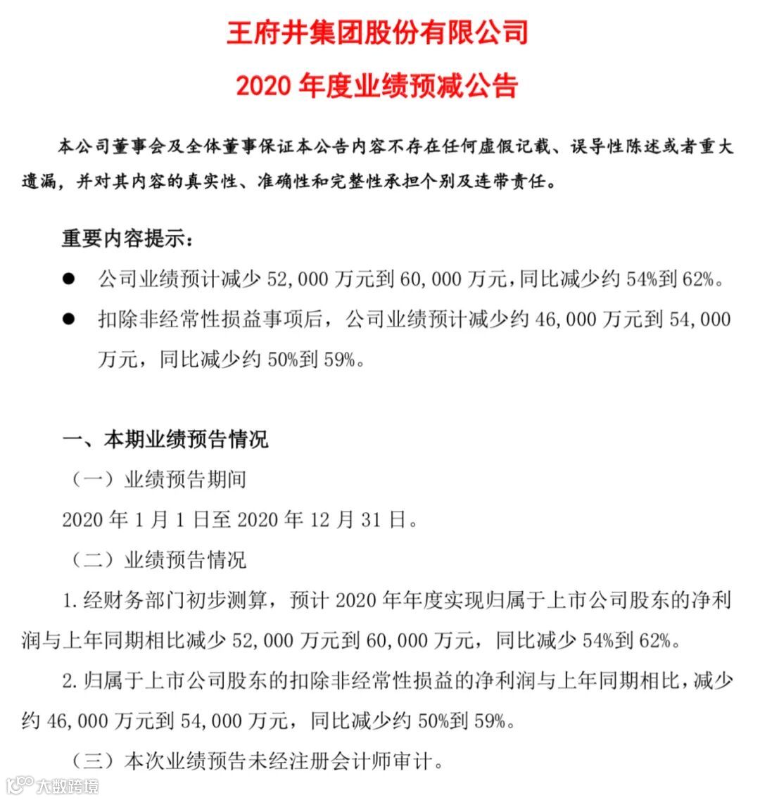 值得关注的是,在公布合并首商股份的同时,王府井披露了2020年业绩预减公告。公告显示,2020年王府井净利润同比减少5.2亿元至6亿元,同比减少54%至62%。