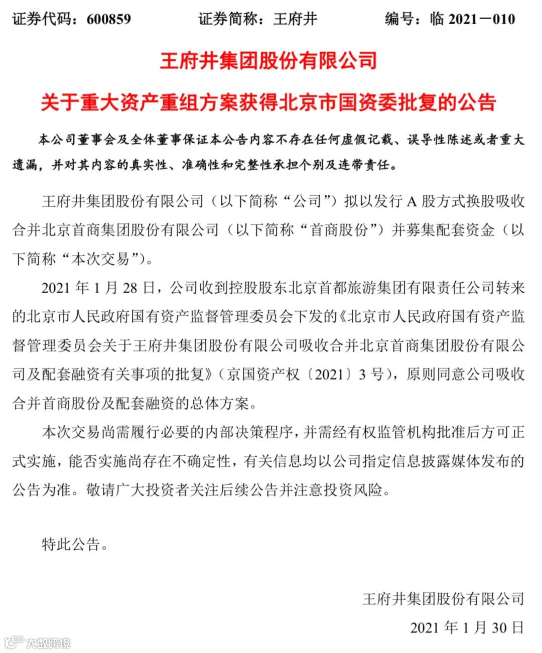 1月29日晚,王府井公告称,拟以发行A股方式换股吸收合并首商股份,打造具有国际水准、国内一流的现代商业零售企业集团。本次换股吸收合并完成后,首商股份将终止上市并注销法人资格。