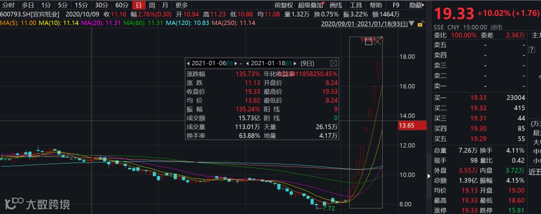 1月6日以来,宜宾纸业连续涨停,截至18日收盘,共收获9个涨停板,总市值从近16亿飙涨到34亿。