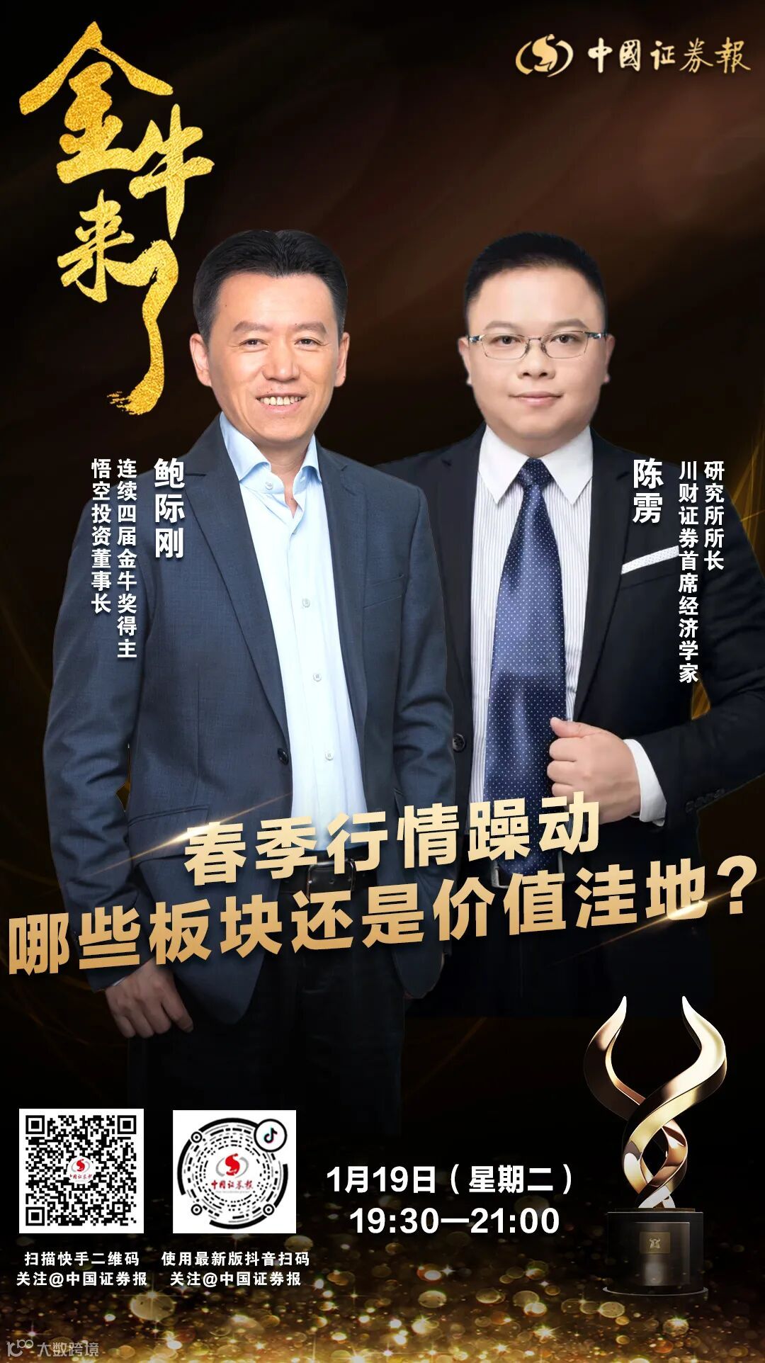 1月19日(周二)晚7点半,悟空投资董事长鲍际刚,川财证券首席经济学家、研究所所长陈雳将做客中证报“金牛来了”,围绕“春季行情躁动 哪些板块还是价值洼地?”主题,为你在线答疑解惑。
