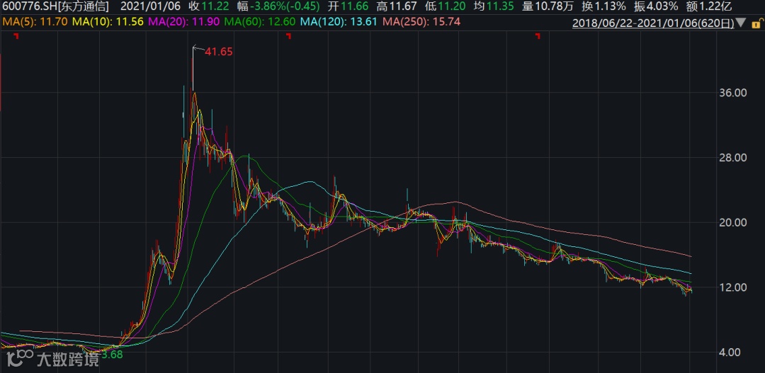 从2018年11月开始,东方通信身披“5G总龙头”光环,股票价格短短几个月涨10倍,但曲终人散后还是走向了连绵不绝的“阴跌”之路。