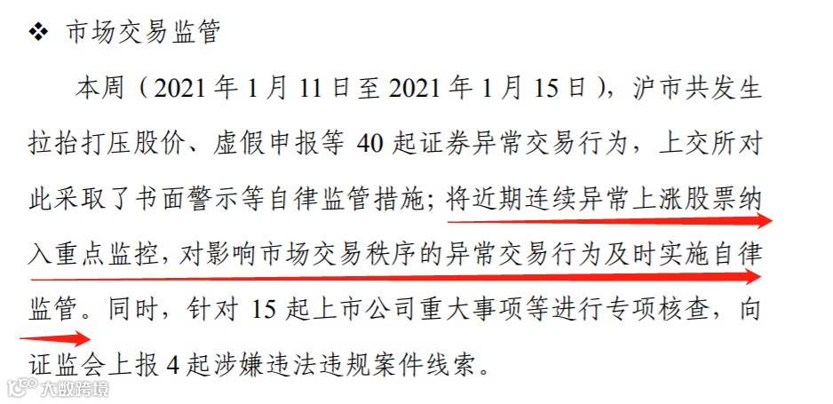 中证君注意到,上周五,即1月15日,上交所例行发布沪市市场运行情况。上交所表示已将近期连续异常上涨股票纳入重点监控,对影响市场交易秩序的异常交易行为及时实施自律监管。