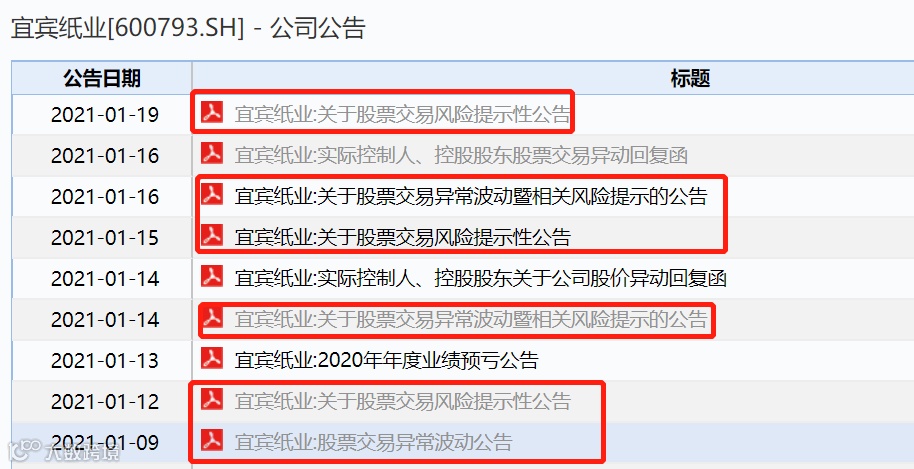 九连板的宜宾纸业再发风险提示公告。