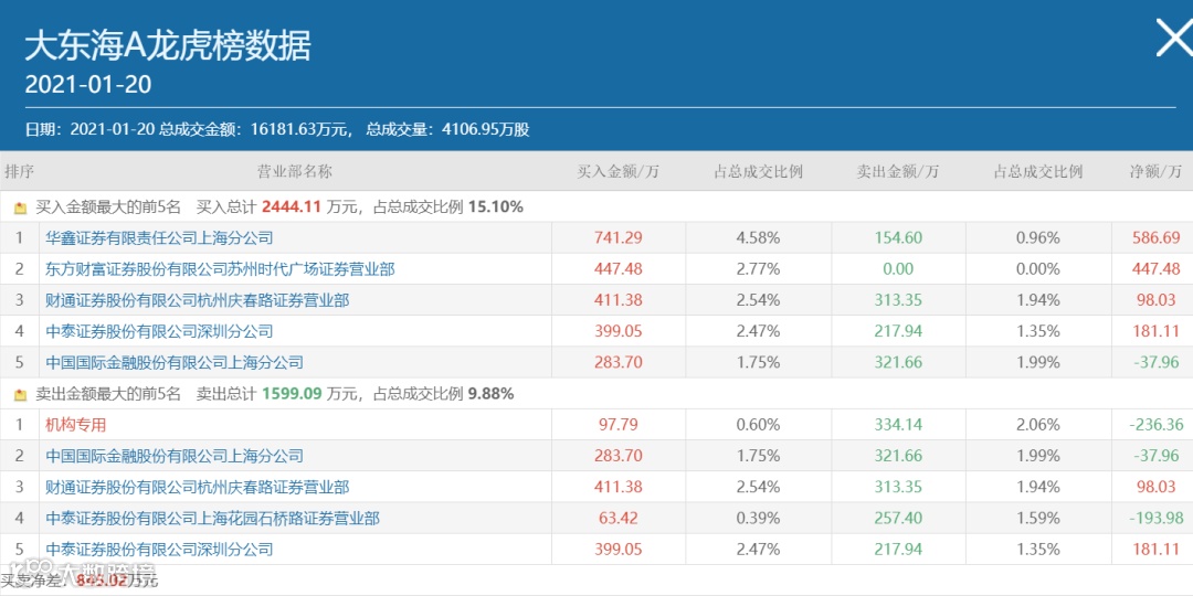 1月18日-20日,财通证券股份有限公司杭州庆春路证券营业部累计买入大东海A441.38万元,同时期间卖出313.35万元;中国国际金融股份有限公司上海分公司累计买入283.70万元,卖出321.66万元;中泰证券股份有限公司深圳分公司买入399.05万元,卖出217.94万元。