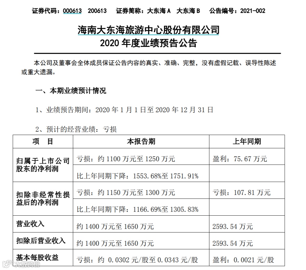 1月21日晚,大东海A公告称,受新型冠状病毒肺炎疫情严重影响等原因,公司主营业务收入较上年同期大幅减少,预计2020年度营业收入约1400万元至1650万元,归母净利润亏损约1100万元至1250万元。