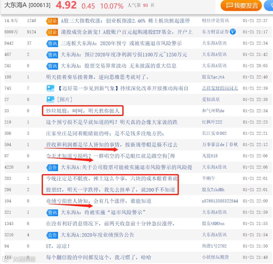 此时此刻,股民们对于大东海A的走向也有不同的看法,有的人认为,公司业绩亏损世人皆知,并不影响股价走势;也有人称,股票ST将凉凉,炒垃圾股市场会教股民做人。