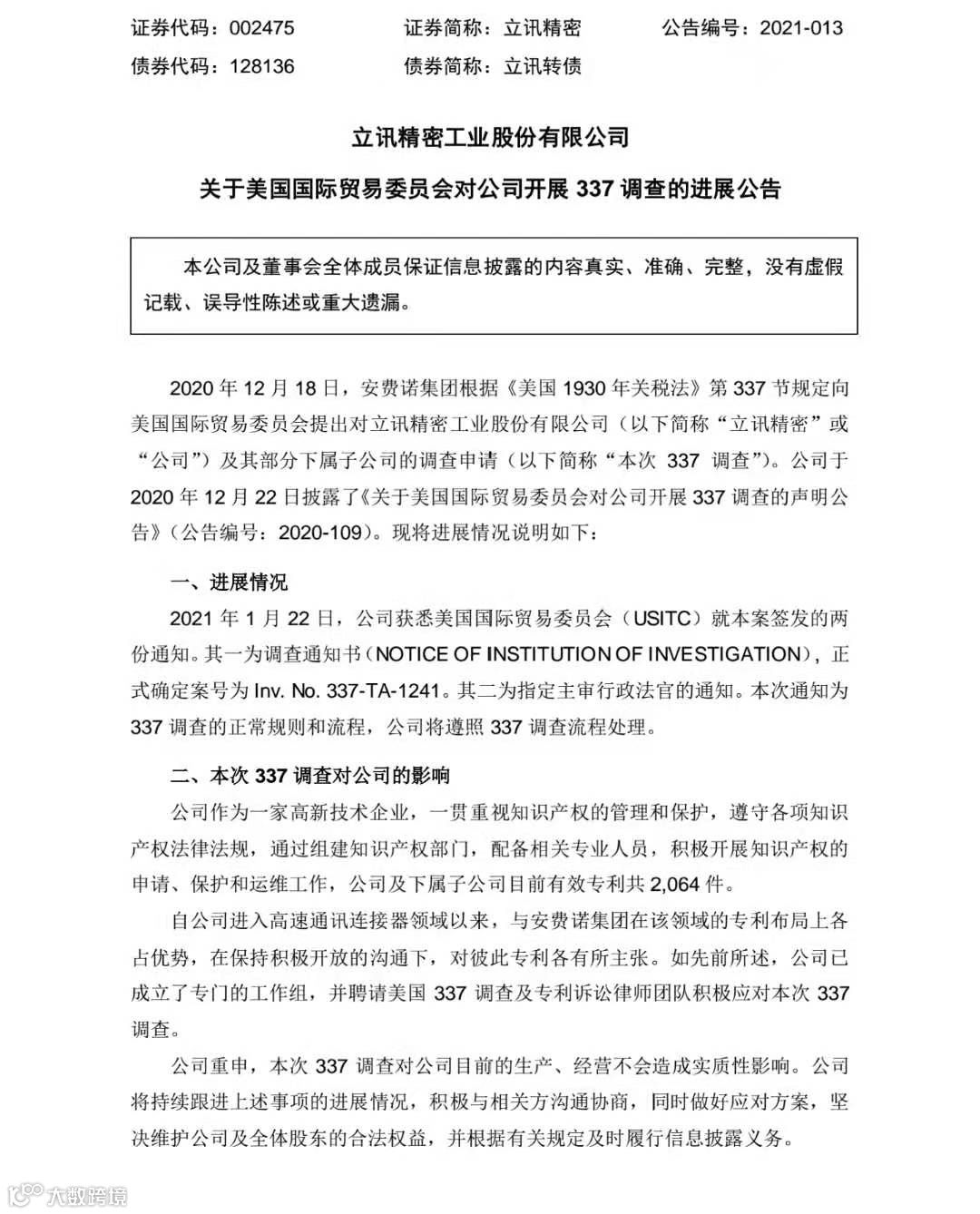 1月24日下午,立讯精密公告称,2021年1月22 日,公司获悉美国国际贸易委员会(USITC)就本案签发的两份通知。其一为调查通知书,正式确定案号为 Inv. No. 337-TA-1241。其二为指定主审行政法官的通知。本次通知为337调查的正常规则和流程,公司将遵照337调查流程处理。