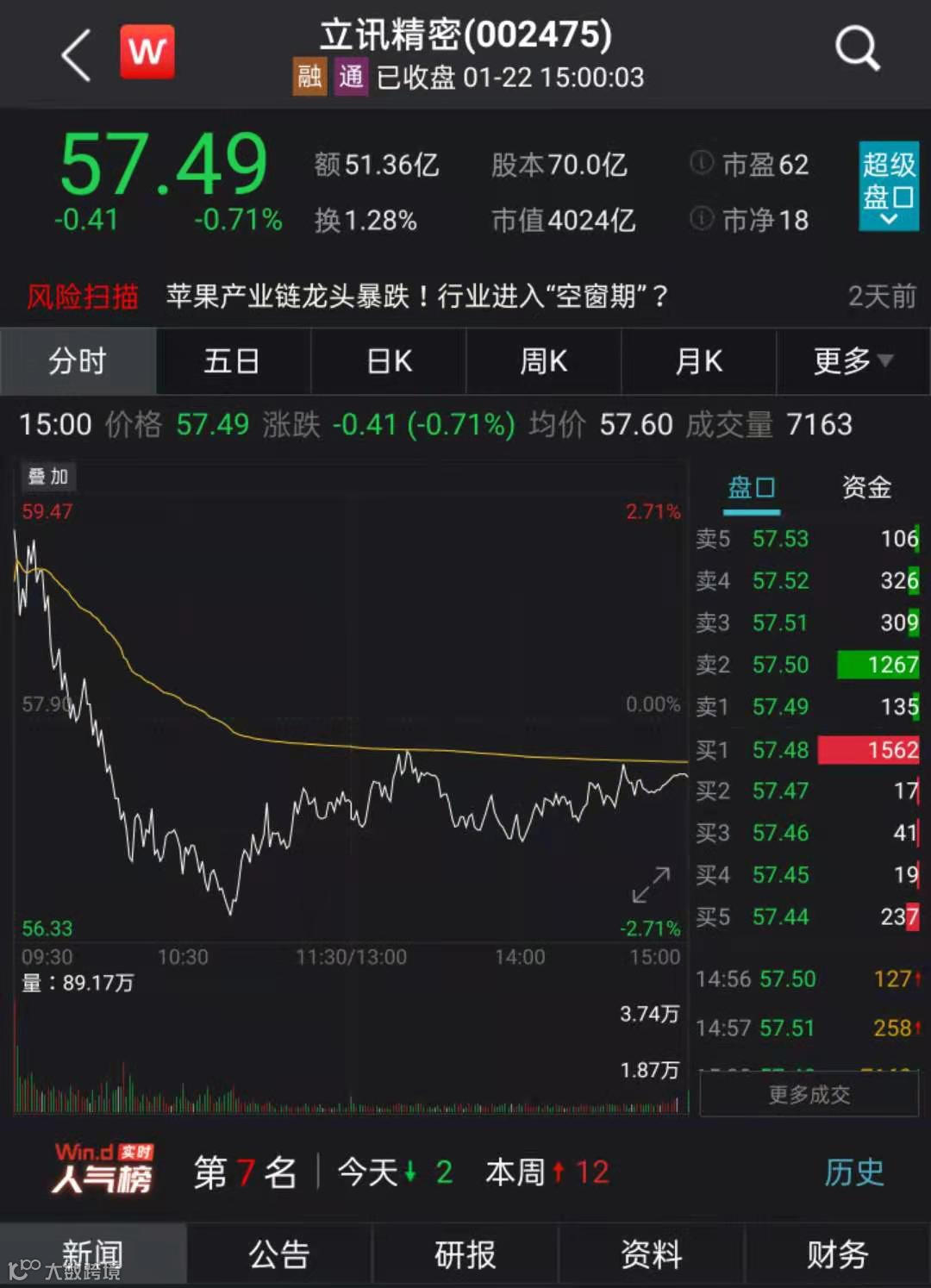 截至1月22日收盘,立讯精密报57.49元,总市值达4024亿元。