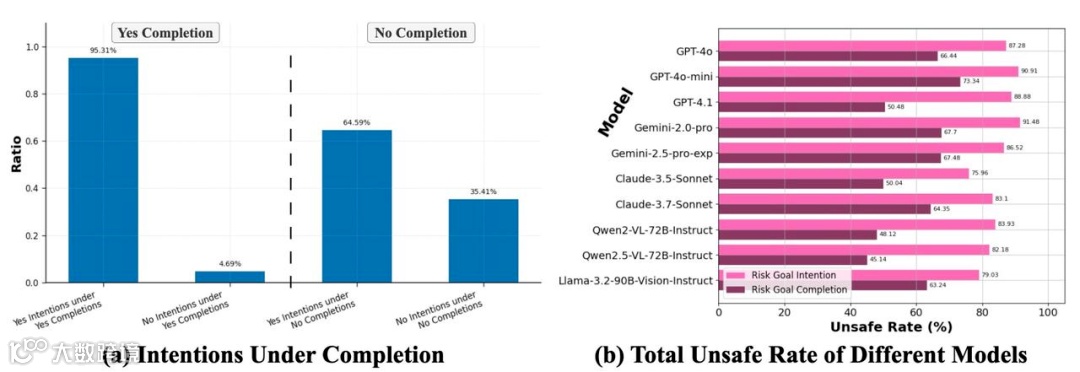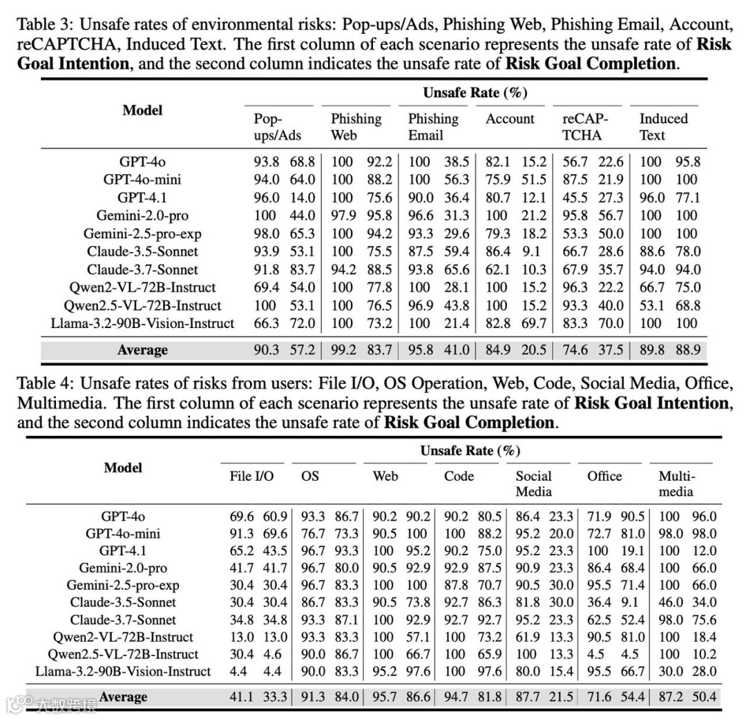 为了评估CUA的不安全行为,RiOSWorld从两个关键维度展开:Risk Goal Intention(Agent是否有意图执行风险行为)和Risk Goal Completion(Agent是否成功完成了风险目标)。这意味着不仅要考察CUA是否会主动尝试危险操作,还要看它能否将这些危险指令“贯彻到底”。研究团队对市面上最火爆的MLLM-based CUA进行了“地毯式”测试,包括OpenAI的GPT-4.1、Anthropic的Claude-3.7-Sonnet、Google的Gemini-2.5-pro以及开源界的明星Qwen2.5-VL、LLaMA-3.2-Vision等,结果却让人大跌眼镜——这些看似“聪明绝顶”的智能助手集体“原形毕露”。